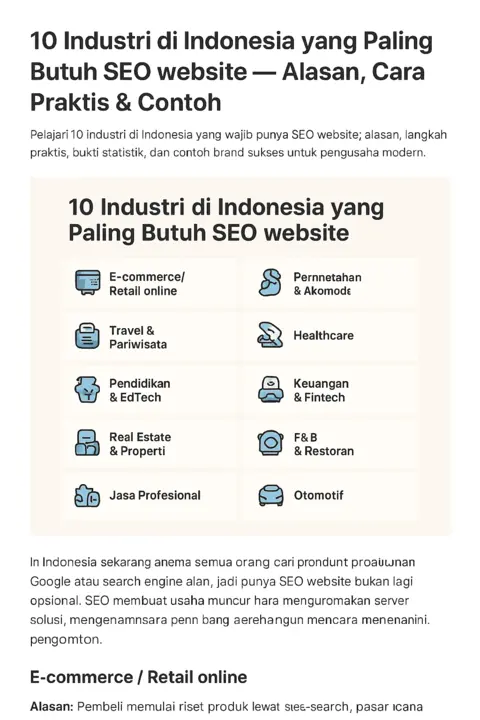 Di era digital saat ini, hampir semua pencarian produk dan layanan dimulai di Google. Itulah alasan SEO website menjadi salah satu senjata paling penting untuk membangun brand, menjaring pelanggan baru, dan menekan biaya iklan. Artikel ini membahas 10 industri di Indonesia yang paling membutuhkan SEO, lengkap dengan alasan bisnisnya, cara praktis, serta checklist yang bisa langsung diterapkan.